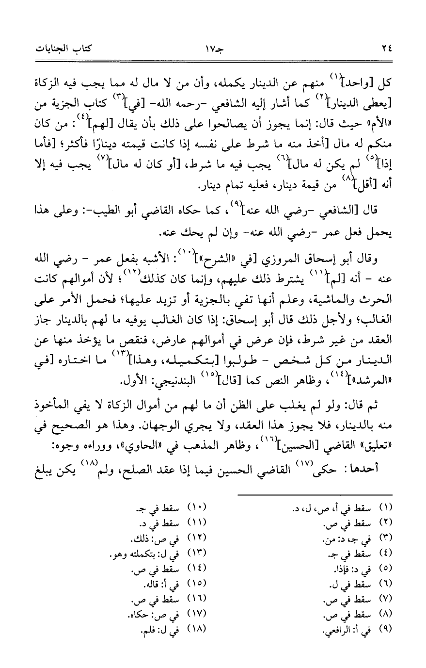 ثم قال: ولو لم يغلب على الظن أن ما لهم من أموال الزكاة لا يفي المأخوذ منه بالدينار، فلا يجوز هذا العقد، ولا يجري الوجهان. وهذا هو الصحيح في "تعليق" القاضي [الحسين]، وظاهر المذهب في "الحاوي"، ووراءه وجوه: