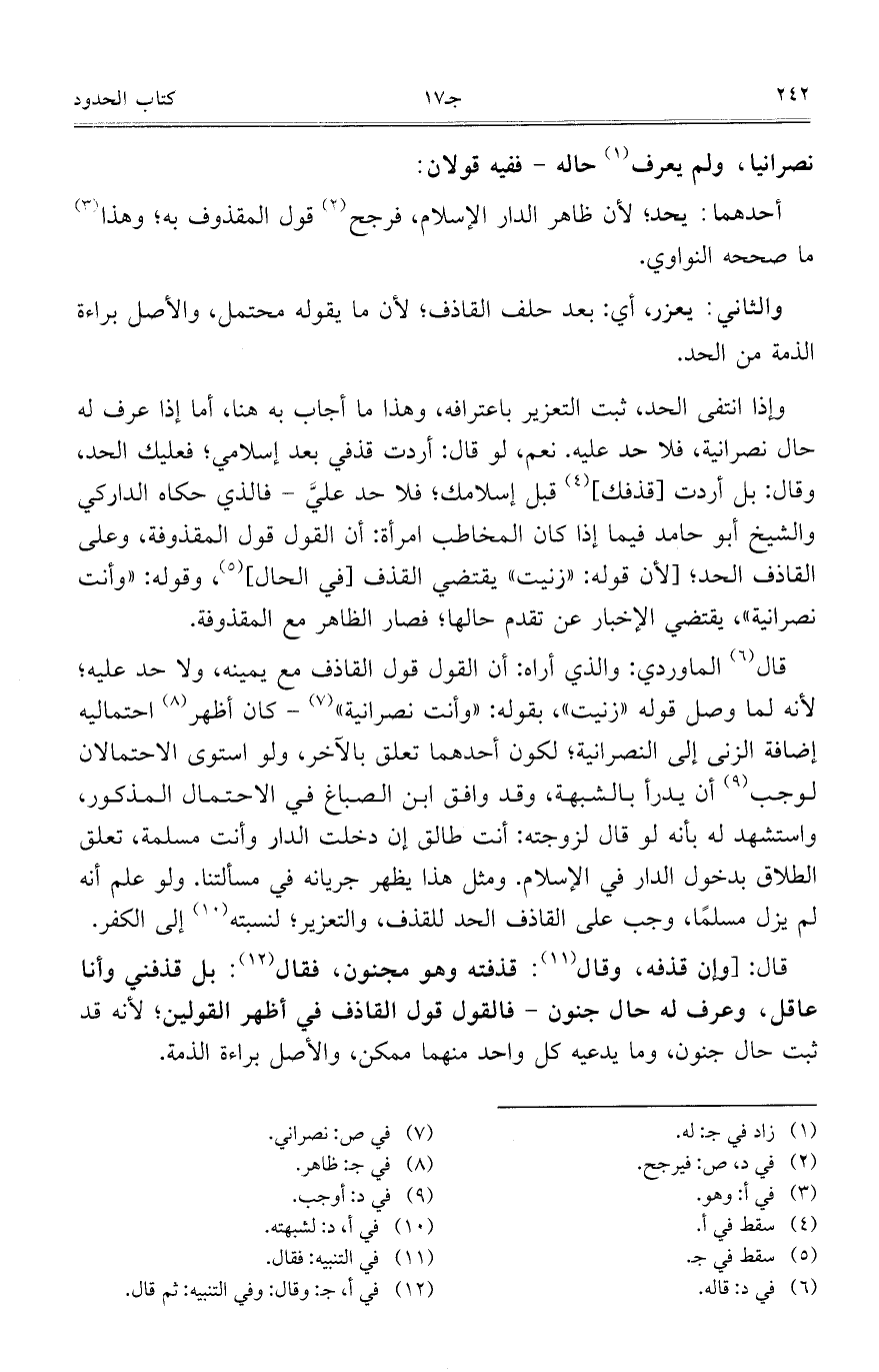 قال الماوردي: والذي أراه: أن القول قول القاذف مع يمينه، ولا حد عليه؛ لأنه لما وصل قوله "زنيت"، بقوله: "وأنت نصرانية" - كان أظهر احتمالية إضافة الزنى إلى النصرانية؛ لكون أحدهما تعلق بالآخر، ولو استوى الاحتمالان لوجب أن يدرأ بالشبهة، وقد وافق ابن الصباغ في الاحتمال المذكور، واستشهد له بأنه لو قال لزوجته: أنت طالق إن دخلت الدار وأنت مسلمة، تعلق الطلاق بدخول الدار في الإسلام. ومثل هذا يظهر جريانه في مسألتنا. ولو علم أنه لم يزل مسلما، وجب على القاذف الحد للقذف، والتعزير؛ لنسبته إلى الكفر.