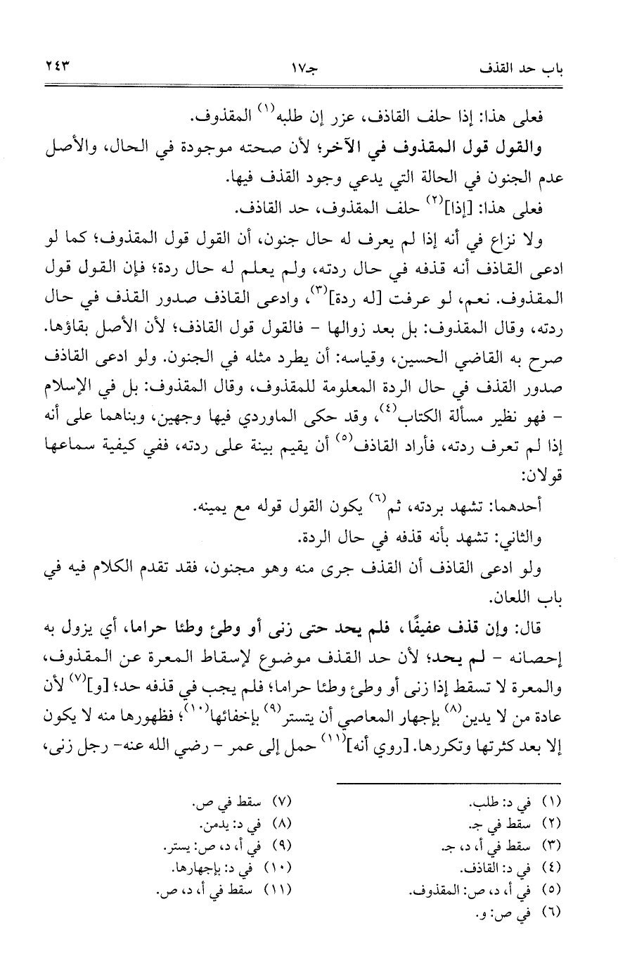 ولا نزاع في أنه إذا لم يعرف له حال جنون، أن القول قول المقذوف؛ كما لو ادعى القاذف أنه قذفه في حال ردته، ولم يعلم له حال ردة؛ فإن القول قول المقذوف. نعم، لو عرفت [له ردة]، وادعى القاف صدور القذف في حال ردته، وقال المقذوف: بل بعد زوالها - فالقول قول القاذف؛ لأن الأصل بقاؤها. صرح به القاضي الحسين، وقياسه: أن يطرد مثله في الجنون. ولو ادعى القاذف صدور القذف في حال الردة المعلومة للمقذوف، وقال المقذوف: بل في الإسلام - فهو نظير مسألة الكتاب، وقد حكى الماوردي فيها وجهين، وبناهما على أنه إذا لم تعرف ردته، فأراد القاذف أن يقيم بينة على ردته، ففي كيفية سماعها قولان: