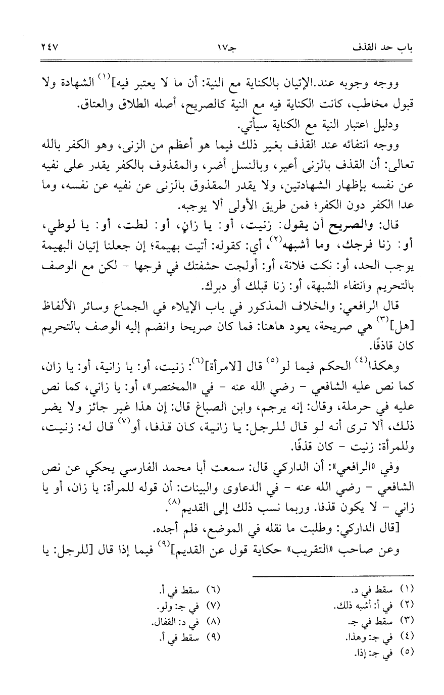 قال الرافعي: والخلاف المذكور في باب الإيلاء في الجماع وسائر الألفاظ [هل] هي صريحة، يعود هاهنا: فما كان صريحا وانضم إليه الوصف بالتحريم كان قاذفا.