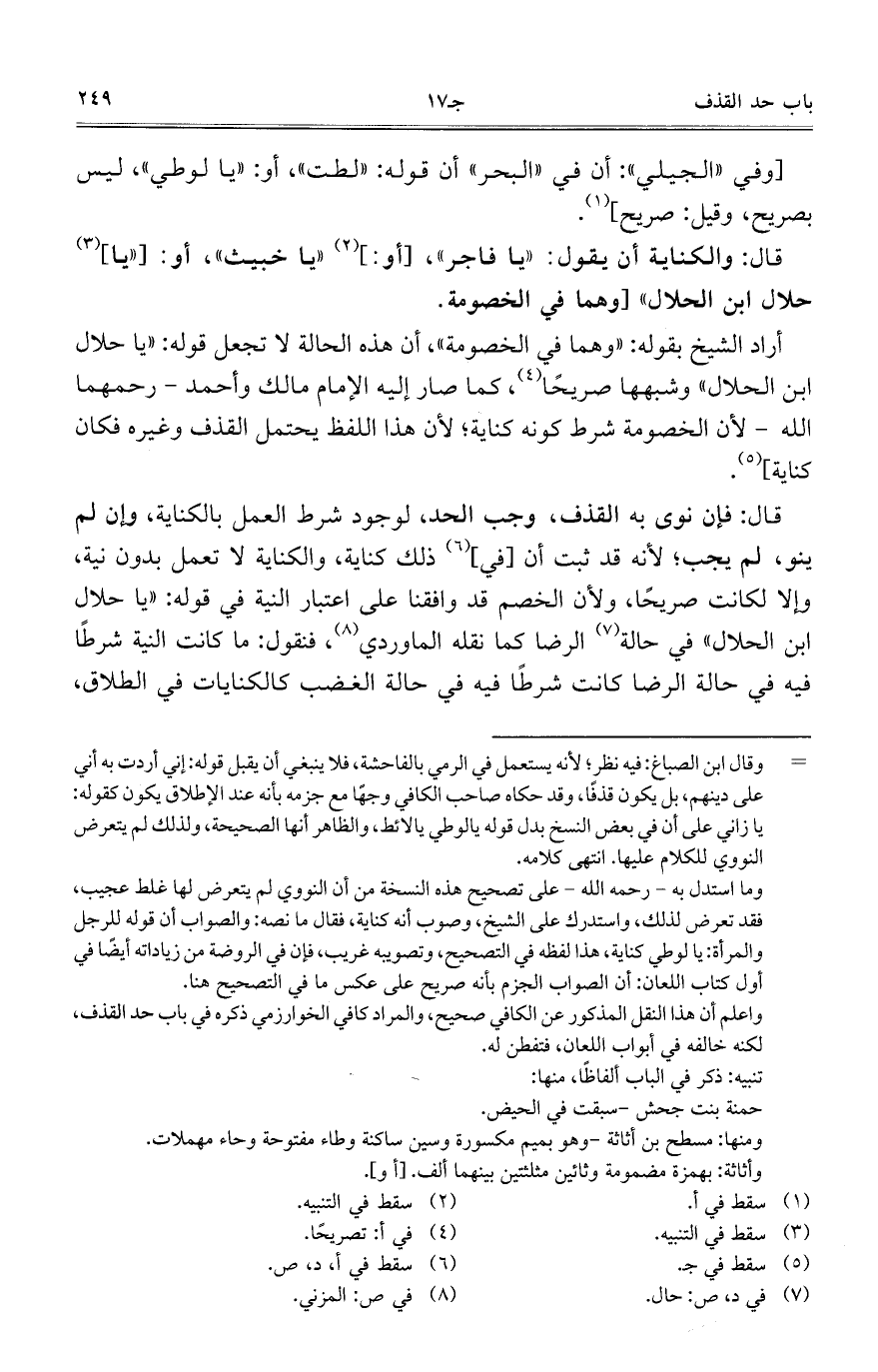 قال: والكناية أن يقول: "يا فاجر"، [أو:] "يا خبيث"، أو: ["يا] حلال ابن الحلال" [وهما في الخصومة.