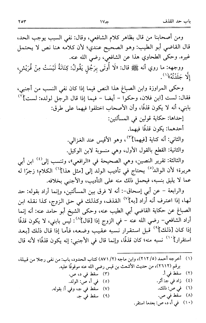 ومن أصحابنا من قال: بظاهر كلام الشافعي، وقال: نفي السبب يوجب الحد، قال القاضي أبو الطيب: وهو الصحيح عندي؛ لأن كلامه هنا لا يحتمل غيره. وحكى الطحاوي هذا عن الشافعي، رضي الله عنه.