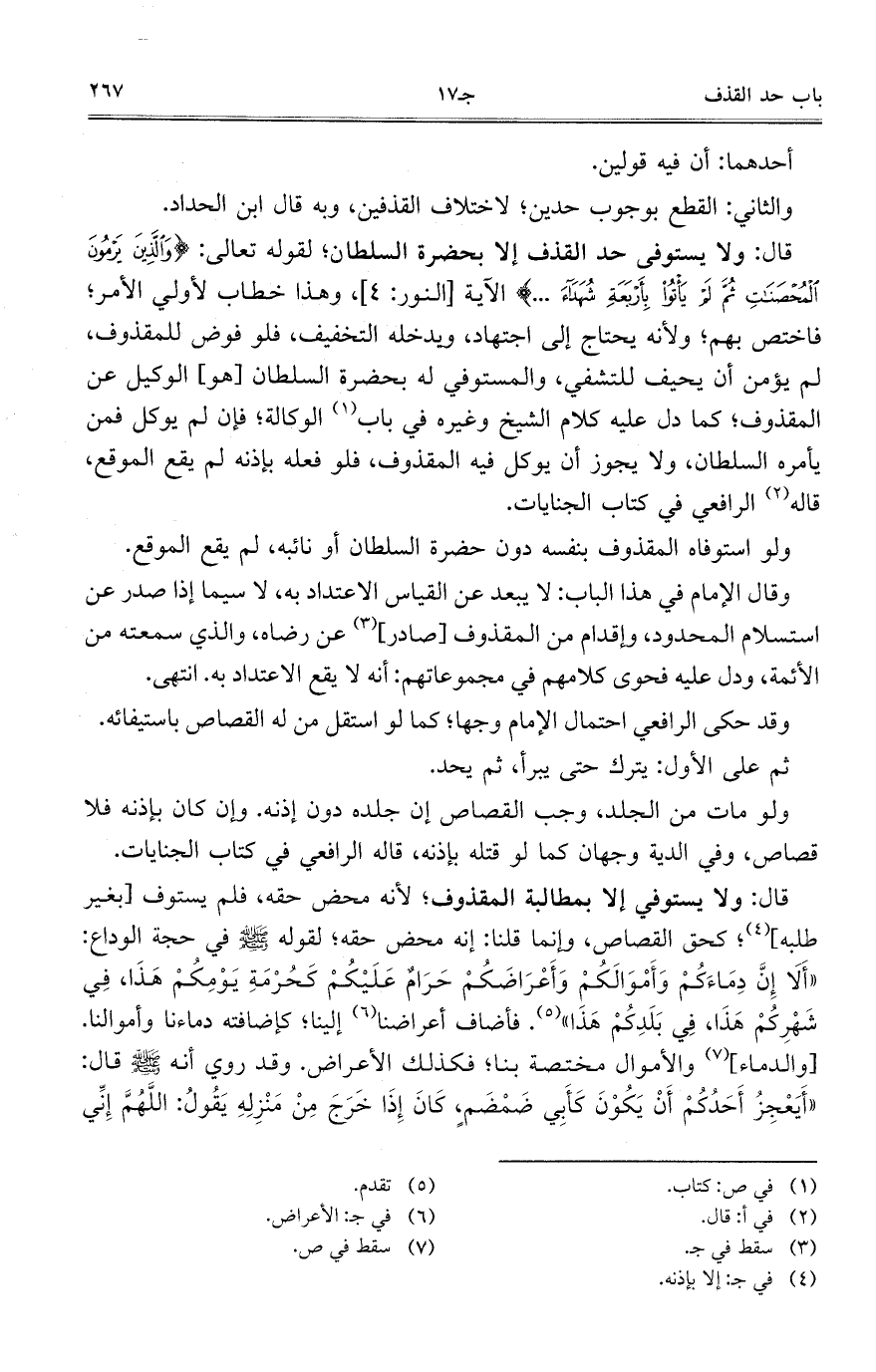 قال: ولا يستوفي إلا بمطالبة المقذوف؛ لأنه محض حقه، فلم يستوف [بغير طلبه]؛ كحق القصاص، وإنما قلنا: إنه محض حقه؛ لقوله صلى الله عليه وسلم في حجة الوداع: "ألا إن دماءكم وأموالكم وأعراضكم حرام عليكم كحرمة يومكم هذا، في شهركم هذا، في بلدكم هذا". فأضاف أعراضنا إلينا؛ كإضافته دماءنا واموالنا. [والدماء] والموال مختصة بنا؛ فكذلك العراض. وقروي أنه صلى الله عليه وسلم قال: "أيعجز أحدكم أن يكون كأبي ضمضم، كان إذا خرج من منزله يقول: اللهم إني