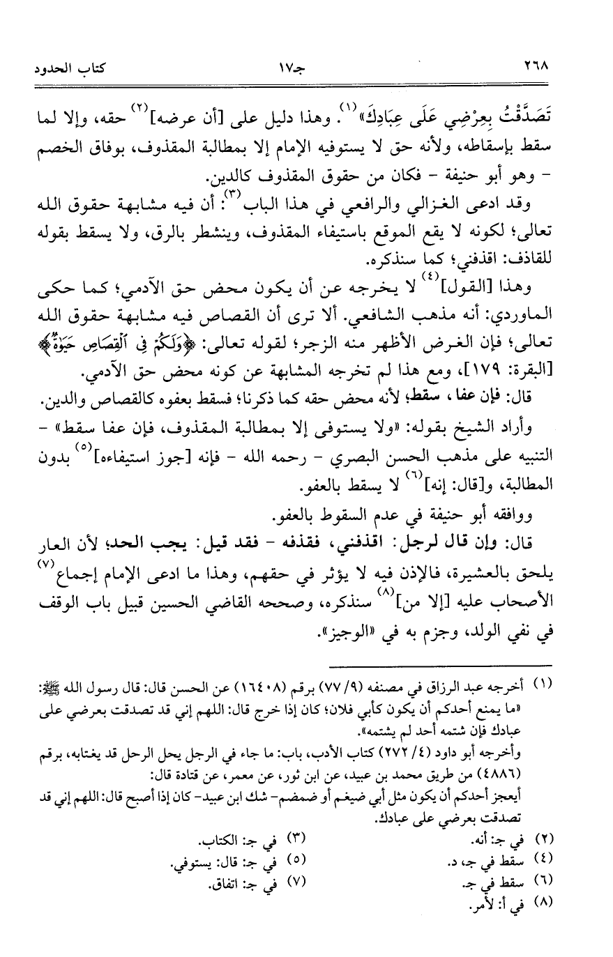 تصدقت بعرضي على عبادك". وهذا دليل على [أن عرضه] حقه، وإلا لما سقط باسقاطه، ولأنه حق لا يستوفيه الإمام إلا بمطالبة المقذوف، بوفاق الخصم -وهو أبو حنيفة- فكان من حقوق المقذوف كالدين.