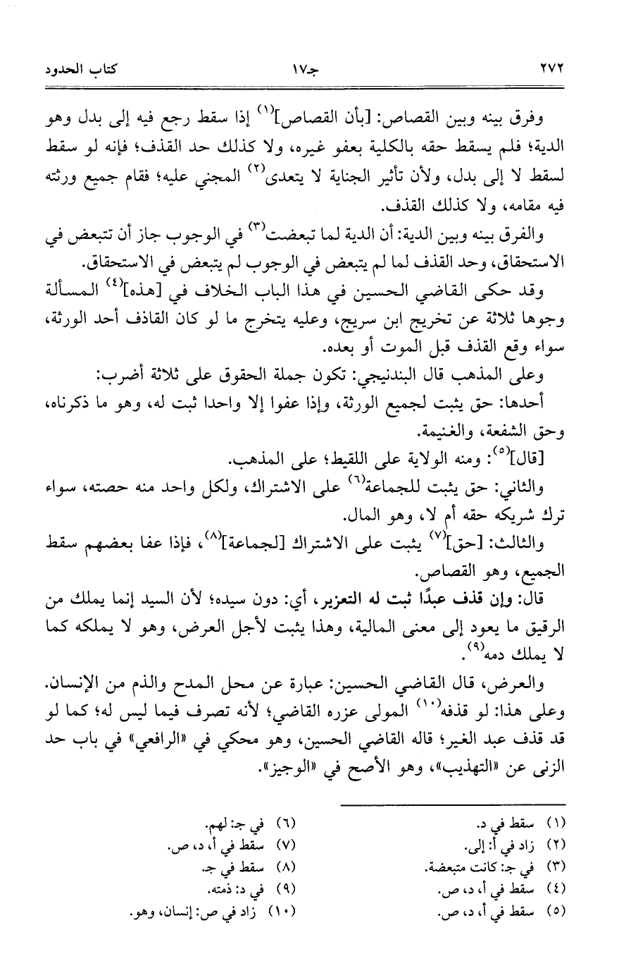 وفرق بينه وبين القصاص: [بأن القصاص] إذا سقط رجع فيه إلى بدل وهو الدية؛ فلم يسقط حقه بالكلية بعفو غيره، ولا كذلك حد القذف؛ فإنه لو سقط لسقط لا إلى بدل، ولأن تأثير الجناية لا يتعدى المجنى عليه؛ فقام جميع ورثته فيه مقامه، ولا كذلك القذف.