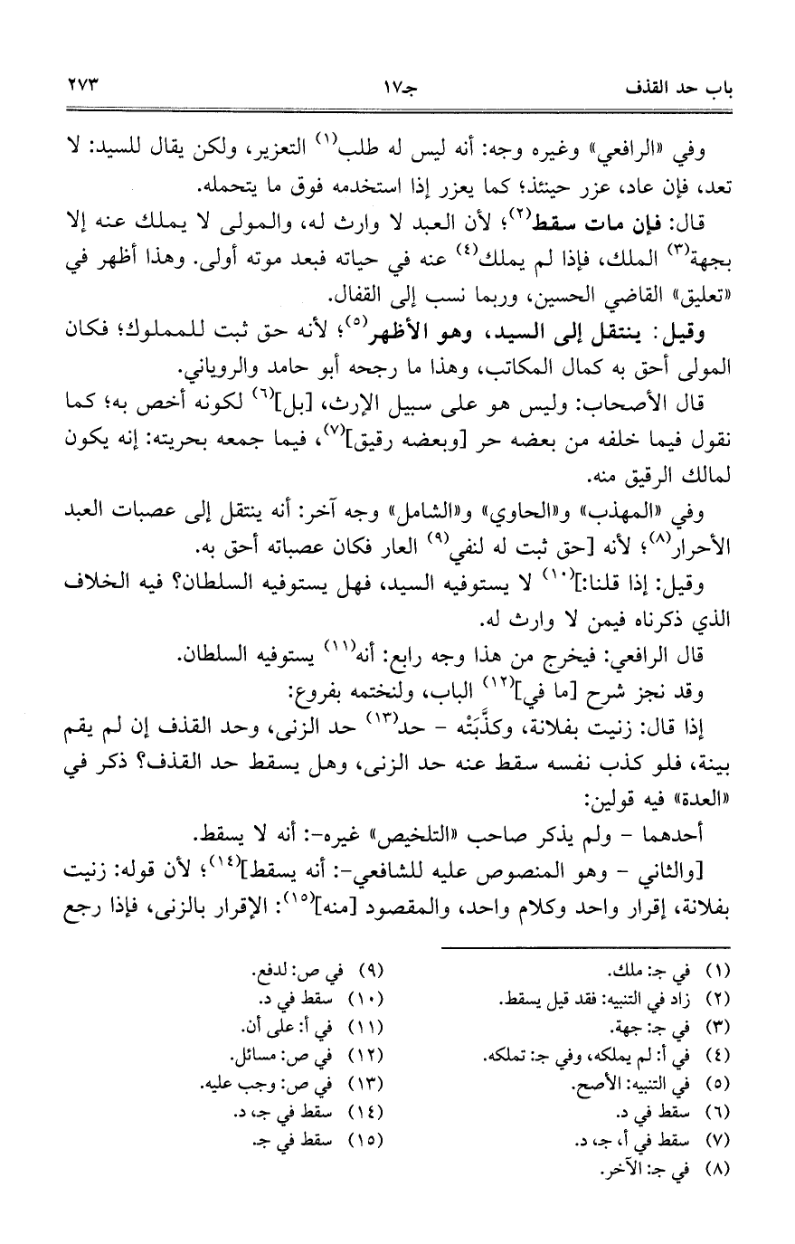 قال: فإن مات سقط؛ لأن العبد لا وارث له، والمولى لا يملك عنه بجهة الملك، فإذا لم يملك عنه في حياته فبعد موته أولى. وهذا أظهر في "تعليق" القاضي الحسين، وربما نسب إلى القفال.