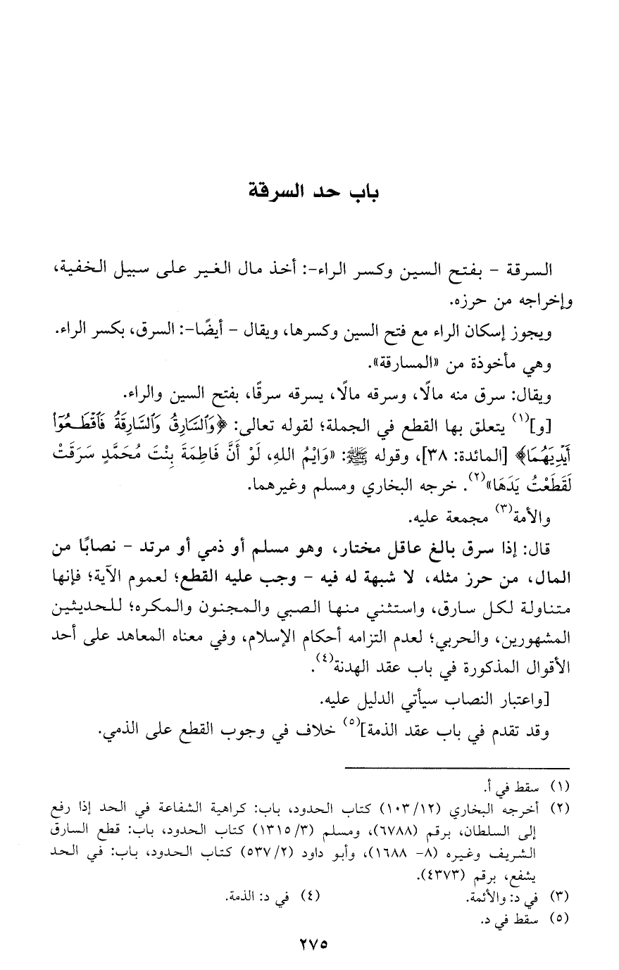[و] يتعلق بها القطع في الجملة؛ لقوله تعالى: {والسارق والسارقة فاقطعوا أيديها} [المائدة: 38]، وقوله صلى الله عليه وسلم: "وايم الله، لو أن فاطمة بنت محمد سرقت لقطعت يدها". خرحه البخاري ومسلم وغيرهما.