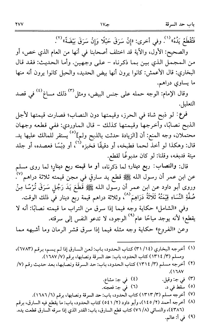 قال: والنصاب: ربع دينار؛ لما ذكرناه، أو ما قيمته ربع دينار؛ لما روى مسلم عن ابن عمر أن رسول الله صلى الله عليه وسلم قطع يد سارق في مجن قيمته ثلاثة دراهم. وروى أبو داود عن ابن عمر أن رسول الله صلى الله عليه وسلم قطع يد رجل سرق ترسا من صفة النساء قيمته ثلاثة دراهم، وثلاثة دراهم قيمة ربع دينار في ذلك الوقت.