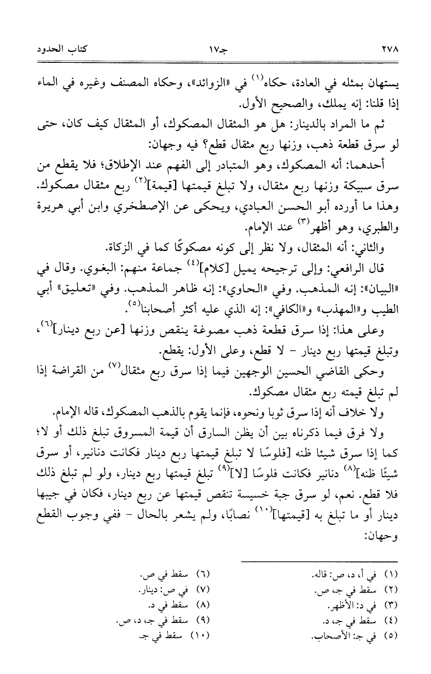 ثم ما المراد بالدينار: هل هو المثقال المصكوك، أو المثقال كيف كان، حتى لو سرق قطعة ذهب، وزنها ربع مثقال قطع؟ فيه وجهان: