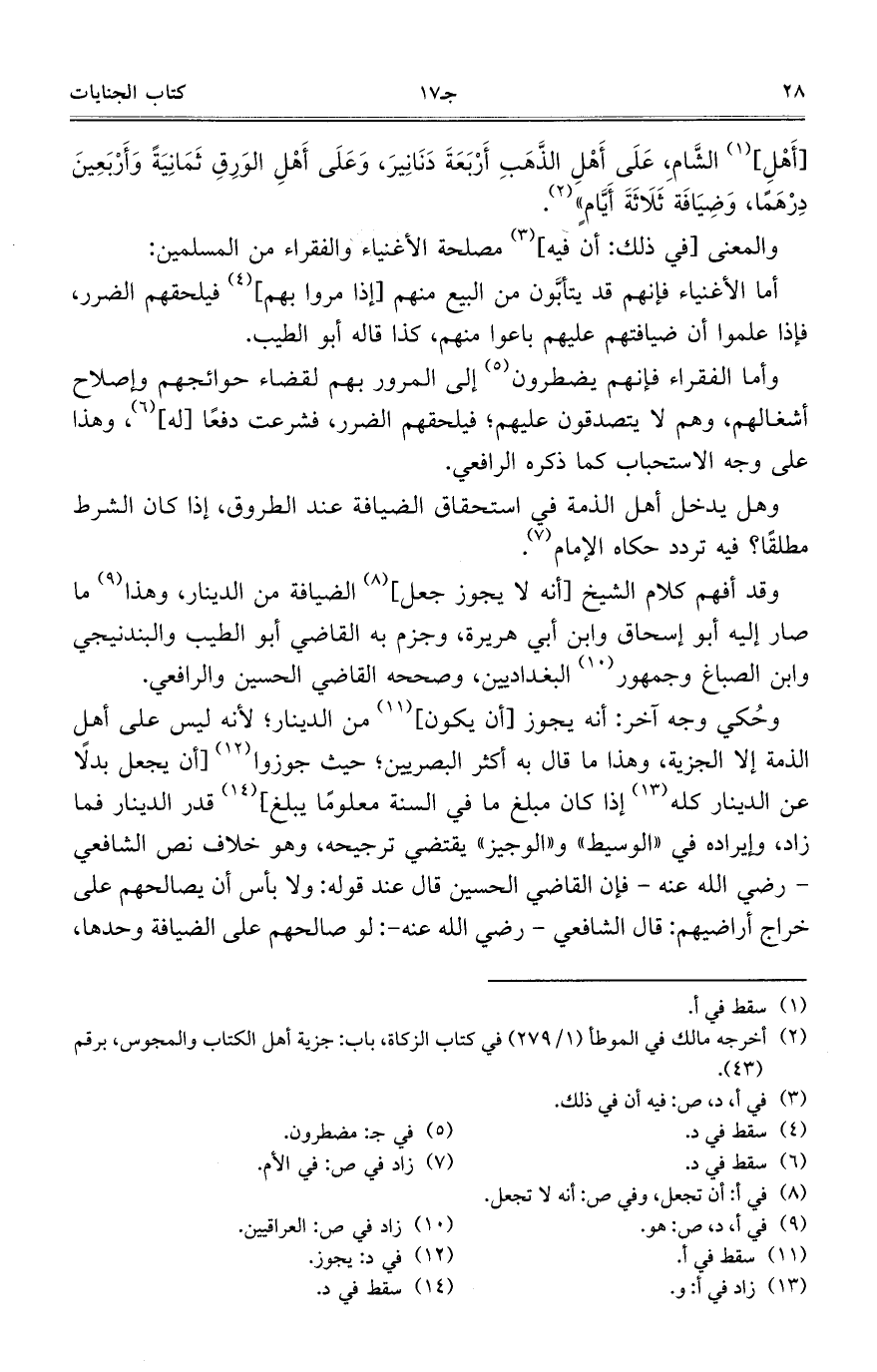 [أهل] الشام، على أهل الذهب أربعة دنانير، وعلى أهل الورق ثمانية وأربعين درهما، وضيافة ثلاثة أيام".