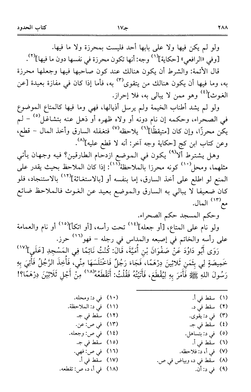 ولو لم يشتد أطناب الخيمة ولم يرسل أذيالها، فهي وما فيها كالمتاع الموضوع في الصحراء، وحكمه إن نام دونه أو ولاه ظهره أو ذهل عنه بتشاغل لم يكن محرزا، وإن كان [متيقظا] يلاحظه فتغفله السارق وأخذ المال – قطع، وعن كتاب ابن كج [حكاية وجه آخر: أنه لا قطع عليه].