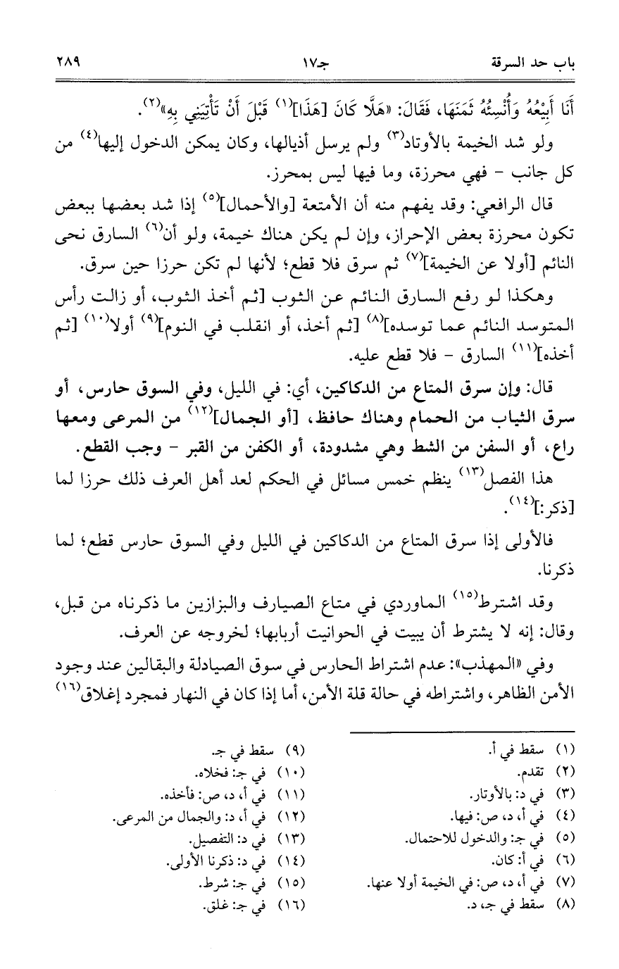 قال الرافعي: وقد يفهم منه أن الأمتعة [والأحمال] إذا شد بعضها ببعض تكون محرزة بعض الإحراز، وإن لم يكن هناك خيمة، ولو أن السارق نحى النائم [أولا عن الخيمة] ثم سرق فلا قطع؛ لأنها لم تكن حرزا حين سرق.