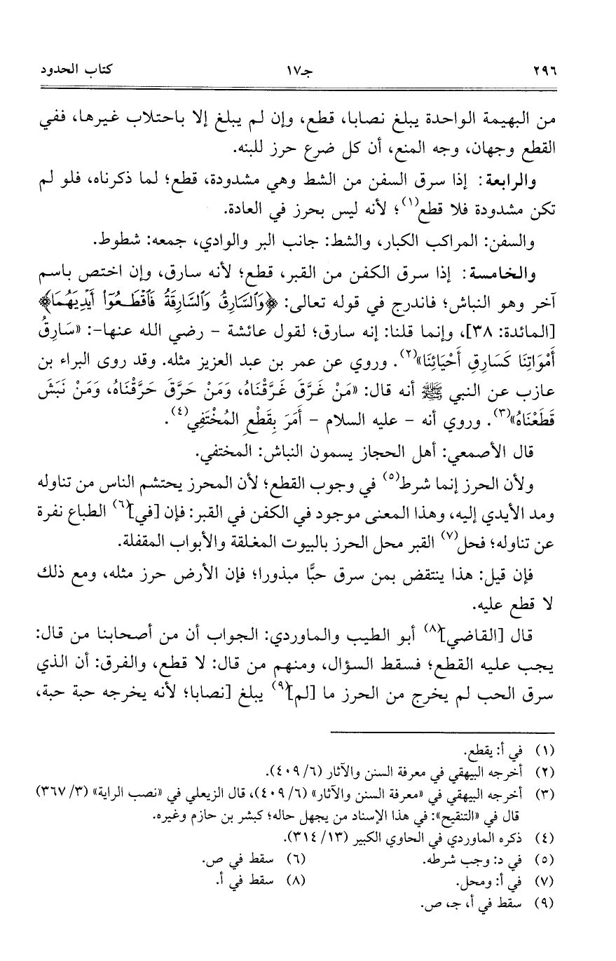 ولأن الحرز إنما شرط في وجوب القطع؛ لأن المحرز يحتشم الناس من تناوله ومد الأيدي إليه، وهذا المعنى موجود في الكفن في القبر: فإن [في] الطباع نفرة عن تناوله؛ فحل القبر محل الحرز بالبيوت المغلقة والأبواب المقفلة.