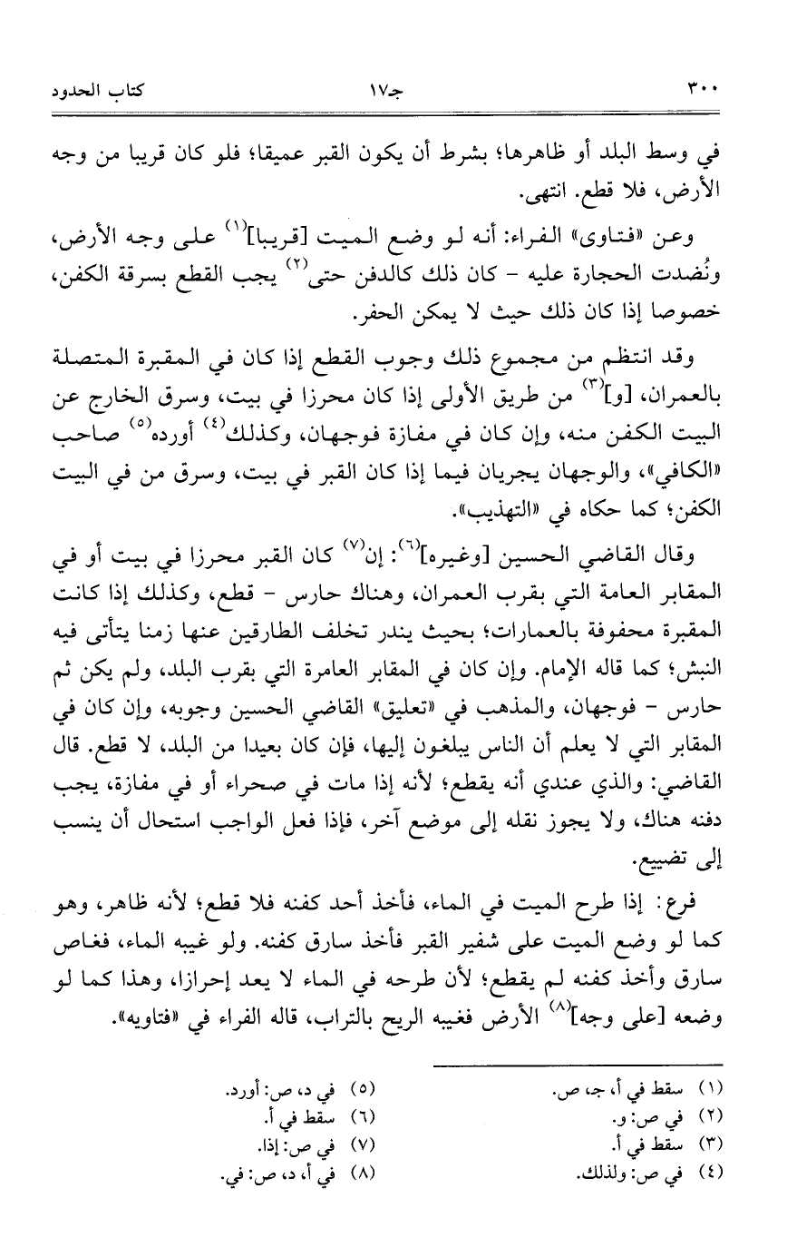 وقال القاضي الحسين [وغيره]: إن كان القبر محرزا في بيت أو في المقابر العامة التي بقرب العمران، وهناك حارس – قطع، وكذلك إذا كانت المقبرة محفوفة بالعمارات؛ بحيث يندر تخلف الطارقين عنها زمنا يتأتى فيه النبش؛ كما قاله الإمام. وإن كان في المقابر العامرة التي بقرب البلد، ولم يكن ثم حارس – فوجهان، والمذهب في "تعليق" القاضي الحسين وجوبه، وإن كان في المقابر التي لا يعلم أن الناس يبلغون إليها، فإن كان بعيدا من البلد، لا قطع. قال القاضي: والذي عندي أنه يقطع؛ لأنه إذا مات في صحراء أو في مفازة، يجب دفنه هناك، ولا يجوز نقله إلى موضع آخر، فإذا فعل الواجب استحال أن ينسب إلى تضييع.