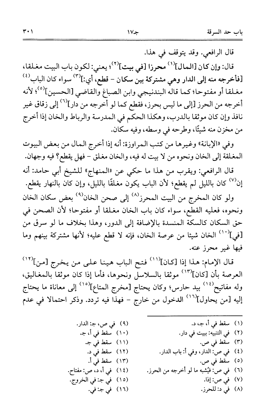 قال الإمام: هذا إذا [كان] فتح الباب هينا على من يخرج [من] العرصة بأن [كان] موثقا بالسلاسل ونحوها، فأما إذا كان موثقا بالمغاليق، وله مفاتيح بيد حارس؛ وكان يحتاج [مخرج المتاع] إلى معاناة ما يحتاج إليه [من يحاول] الدخول من خارج – فهذا فيه تردد. وذكر احتمالا في عدم