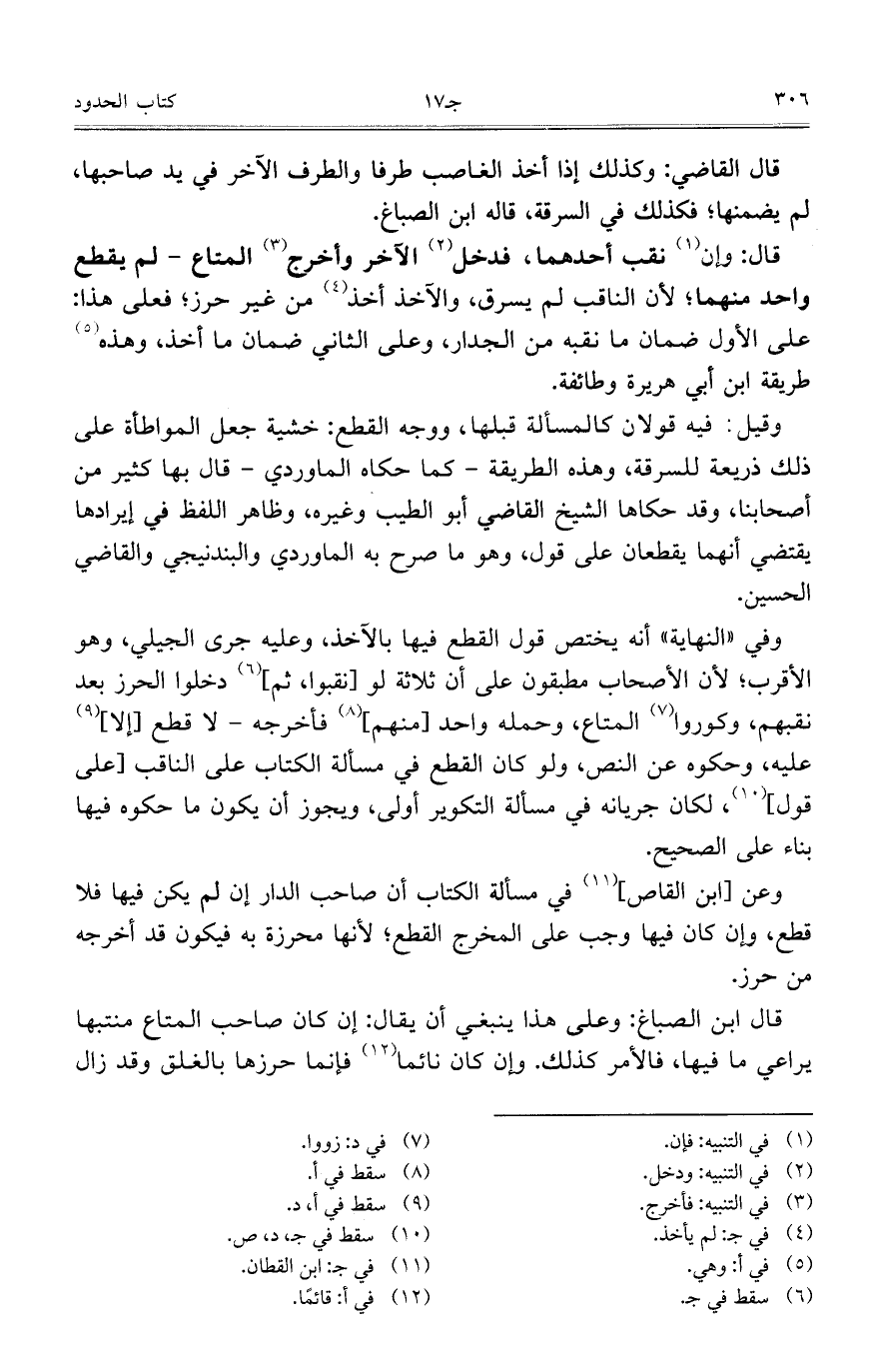 قال: وإن نقب أحدهما، فدخل الآخر وأخرج المتاع – لم يقطع واحد منهما؛ لأن الناقب لم يسرق، والآخذ أخذ من غير حرز؛ فعلى هذا: على الأول ضمان ما نقبه من الجدار، وعلى الثاني ضمان ما أخذ، وهذه طريقة ابن أبي هريرة وطائفة.