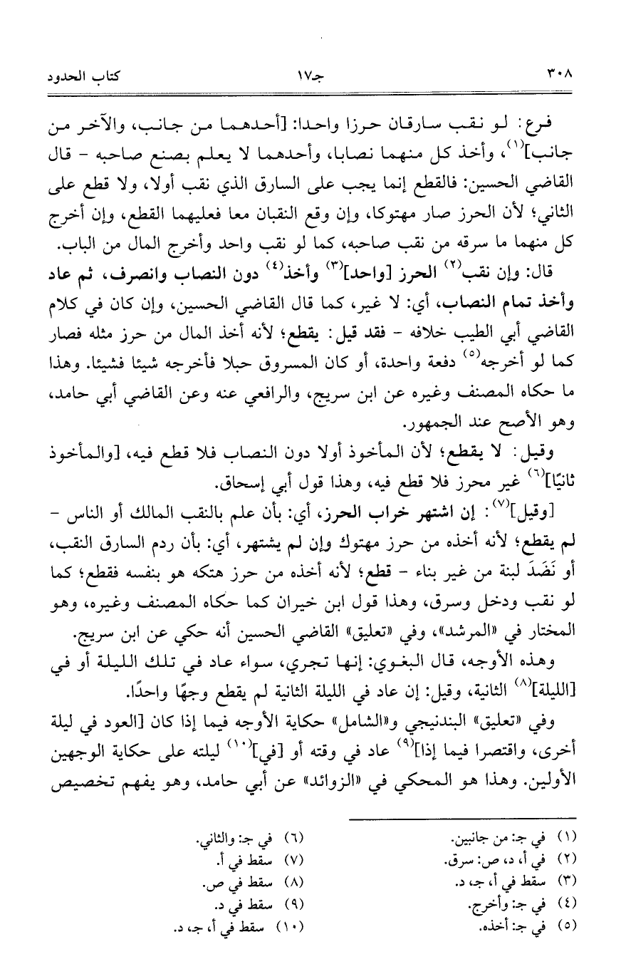 فرع: لو نقب سارقان حرزا واحدا: [أحدهما من جانب، والآخر من جانب]، وأخذ كل منهما نصابا، وأحدهما لا يعلم بصنع صاحبه – قال القاضي الحسين: فالقطع إنما يجب على السارق الذي نقب أولا، ولا قطع على الثاني؛ لأن الحرز صار مهتوكا، وإن وقع النقبان معا فعليهما القطع، وإن أخرج كل منهما ما سرقه من نقيب صاحبه، كما لو نقب واحد وأخرج المال من الباب.
