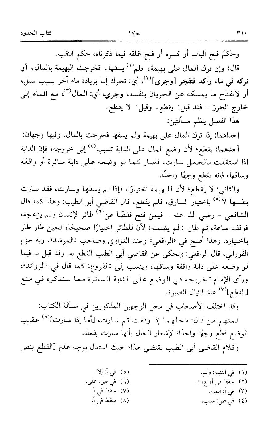 قال: وإن ترك المال على بهيمة، فلم يسقها، فخرجت البهيمة بالمال، أو تركه في ماء راكد فتفجر [وجرى]، أي: تحرك إما بزيادة ماء آخر بسبب سيل، أو لانفتاح ما يمسكه عن الجريان بنفسه، وجرى، أي: المال، مع الماء إلى خارج الحرز – فقد قيل: يقطع، وقيل: لا يقطع.