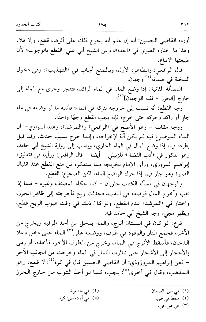 ووجه مقابله – وهو الأصح في "الرافعي" و"المرشد"، وعند النواوي-: أن الماء الموضوع فيه لم يكن آلة لإخراجه، وإنما خرج بسبب حدث، وقد قيل بطرده فيما إذا وضع المال في الماء الجاري، وينسب إلى رواية الشيخ أبي حامد، وهو مذكور في "أدب القضاء" للزبيلي – أيضا – قال الرافعي: ورأيته في "تعليق" إبراهيم المروزي، ورأى الإمام تخريجه مما سنذكره من منع القطع عند انثيال الصبرة وهو جار فيما إذا حرك الواضع الماء، لكن الصحيح: القطع.