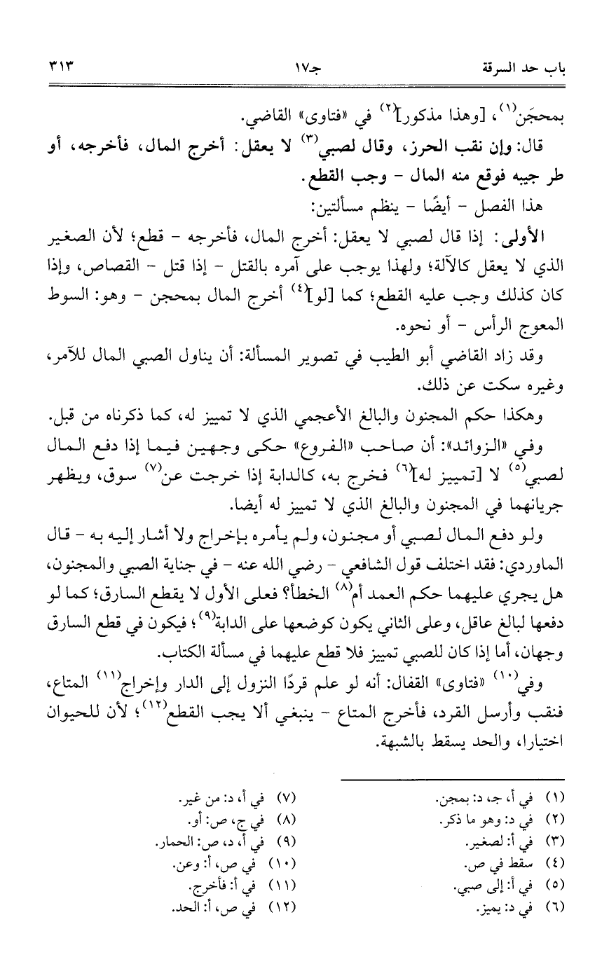 ولو دفع المال لصبي أو مجنون، ولم يأمره بإخراج ولا أشار إليه به – قال الماوردي: فقد اختلف قول الشافعي – رضي الله عنه – في جناية الصبي والمجنون، هل يجري عليهما حكم العمد أم الخطأ؟ فعلى الأول لا يقطع السارق؛ كما لو دفعها لبالغ عاقل، وعلى الثاني يكون كوضعها على الدابة؛ فيكون في قطع السارق وجهان، أما إذا كان للصبي تمييز فلا قطع عليهما في مسألة الكتاب.