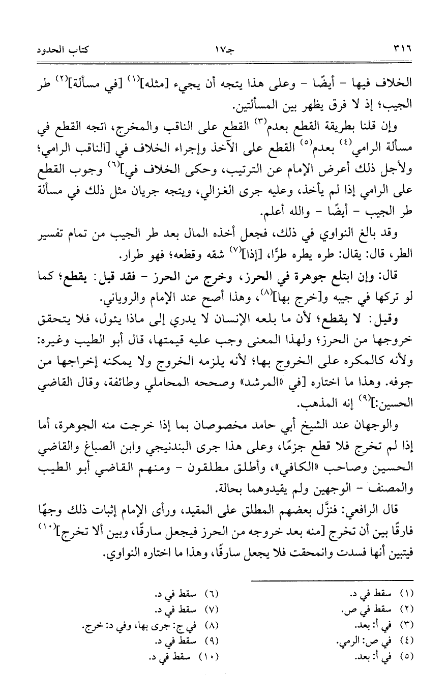 وإن قلنا بطريقة القطع بعدم القطع على الناقب والمخرج، اتجه القطع في مسألة الرامي بعدم القطع على الآخذ وإجراء الخلاف في [الناقب الرامي؛ ولأجل ذلك أعرض الإمام عن الترتيب، وحكى الخلاف في] وجوب القطع على الرامي إذا لم يأخذ، وعليه جرى الغزالي، ويتجه جريان مثل ذلك في مسألة طر الجيب – أيضا – والله أعلم.