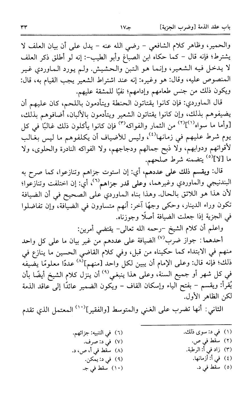 قال الماوردي: فإن كانوا يقتاتون الحنطة ويتأدمون باللحم، كان عليهم أن يضيفوهم بذلك، وإن كانوا يتاتون الشغير ويتأدمون بالألبان، أضافوهم بذلك [وأما ما سواه] من الثمار والفواكه فإن كانوا يأكلون ذلك غالبا في كل يوم شرط عليهم في زمانها، وليس للأضياف أن يكلفوهم ما ليس بغالب لأقواتهم ودوابهم، ولا ذبح جمالهم ودجاجهم، ولا الفواكه النادرة والحلوى، ولا ما [لا] يتضمنه شرط صلحهم.