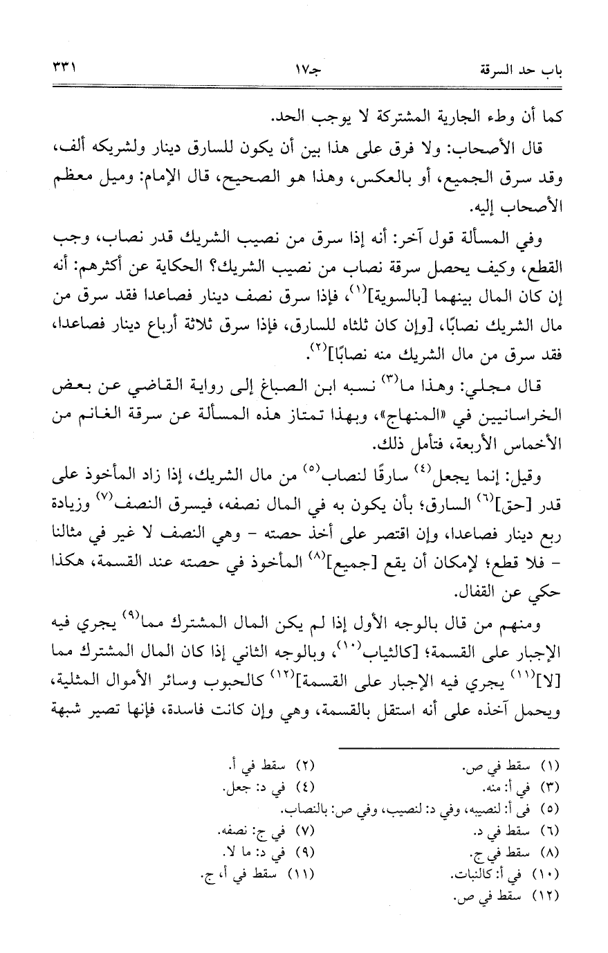 قال الأصحاب: ولا فرق على هذا بين أن يكون للسارق دينار ولشريكه ألف، وقد سرق الجميع، أو بالعكس، وهذا هو الصحيح، قال الإمام: وميل معظم الأصحاب إليه.