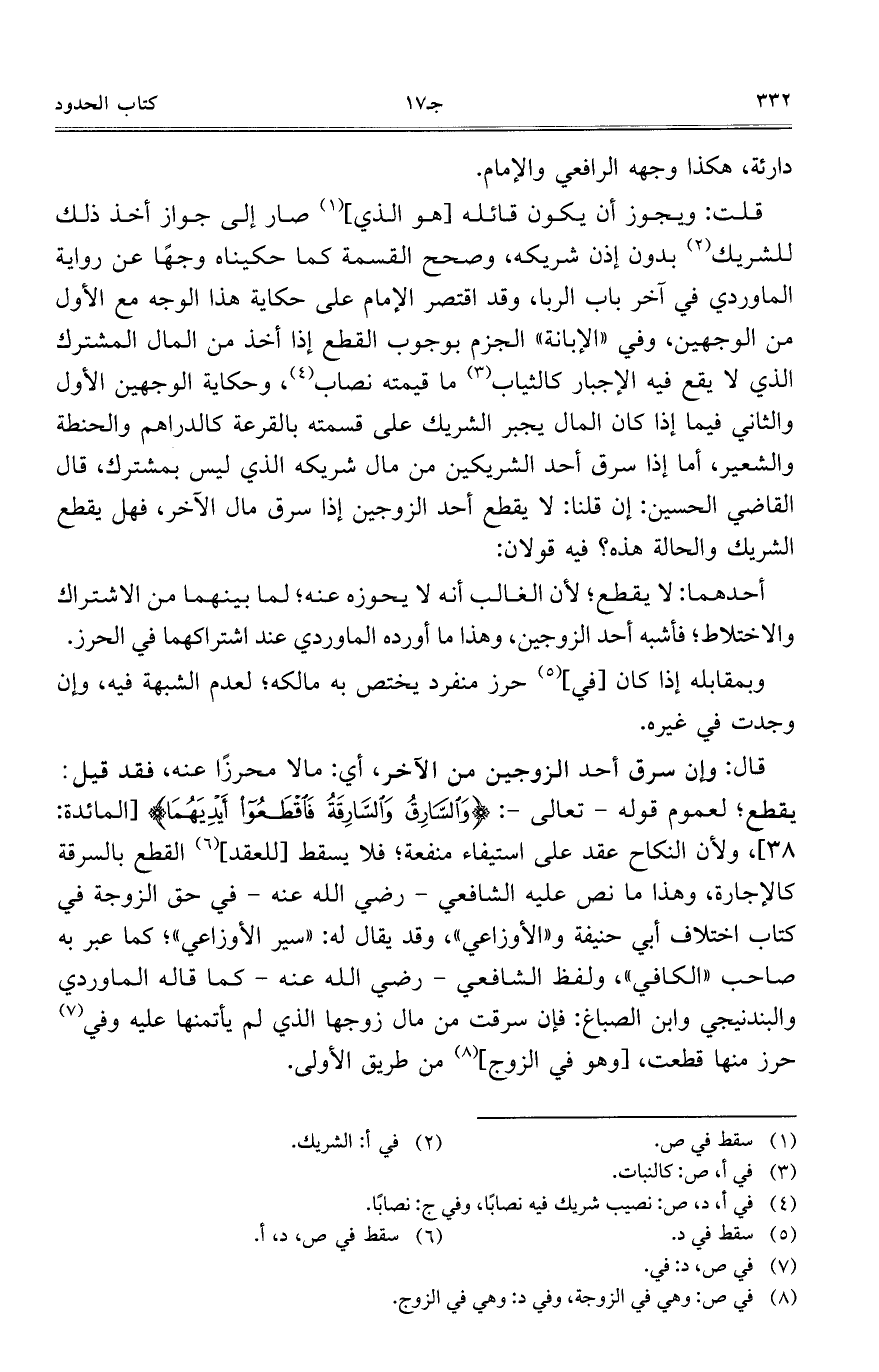 قلت: ويجوز أن يكون قائله [هو الذي] صار إلى جواز أخذ ذلك للشريك بدون إذن شريكه، وصحح القسمة كما حكيناه وجها عن رواية الماوردي في آخر باب الربا، وقد اقتصر الإمام على حكاية هذا الوجه مع الأول من الوجهين، وفي "الإبانة" الجزم بوجوب القطع إذا أخذ من المال المشترك الذي لا يقع فيه الإجبار كالثياب ما قيمته نصاب، وحكاية الوجهين الأول والثاني فيما إذا كان المال يجبر الشريك على قسمته بالقرعة كالدراهم والحنطة والشعير، أما إذا سرق أحد الشريكين من مال شريكه الذي ليس بمشترك، قال القاضي الحسين: إن قلنا: لا يقطع أحد الزوجين إذا سرق مال الآخر، فهل يقطع الشريك والحالة هذه؟ فيه قولان: