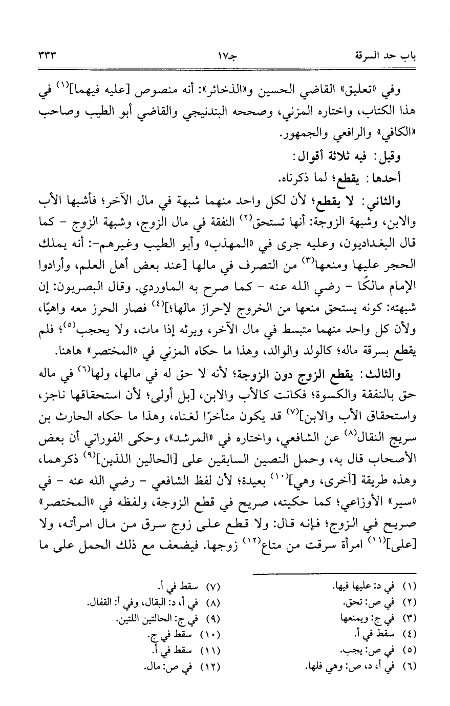 والثالث: يقطع الزوج دون الزوجة؛ لأنه لا حق له في مالها، ولها في ماله حق بالنفقة والكسوة؛ فكانت كالأب والابن، [بل أولى؛ لأن استحقاقها ناجز، واستحقاق الأب والابن] قد يكون متأخرا لغناه، وهذا ما حكاه الحارث بن سريج النقال عن الشافعي، واختاره في "المرشد"، وحكي الفوراني أن بعض الأصحاب قال به، وحمل النصين السابقين على [الحالين اللذين] ذكرهما، وهذه طريقة [أخرى، وهي] بعيدة؛ لأن لفظ الشافعي – رضي الله عنه – في "سير" الأوزاعي؛ كما حكيته، صريح في قطع الزوجة، ولفظه في "المختصر" صريح في الزوج؛ فإنه قال: ولا قطع على زوج سرق من مال امرأته، ولا [على] امرأة سرقت من متاع زوجها. فيضعف مع ذلك الحمل على ما