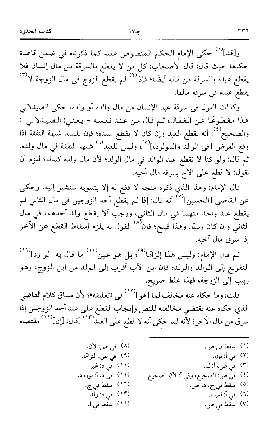 و [قد] حكي الإمام الحكم المنصوص عليه كما ذكرناه في ضمن قاعدة حكاها حيث قال: قال الأصحاب: كل من لا يقطع بالسرقة من مال إنسان فلا يقطع عبده بالسرقة من ماله أيضا؛ فإذا لم يقطع الزوج في مال الزوجة لا يقطع عبده في سرقة مالها.