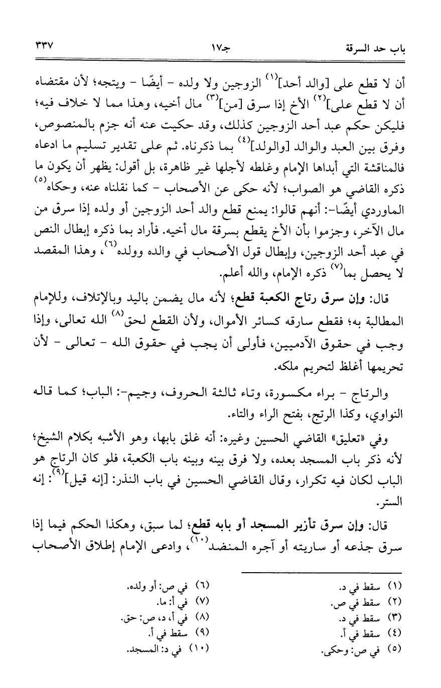 أن لا قطع على [والد أحد] الزوجين ولا ولده – أيضا – ويتجه؛ لأن مقتضاه أن لا قطع على] الأخ إذا سرق [من] مال أخيه، وهذا مما لا خلاف فيه؛ فليكن حكم عبد أحد الزوجين كذلك، وقد حكيت عنه أنه جزم بالمنصوص، وفرق بين العبد والوالد [والولد] بما ذكرناه. ثم على تقدير تسليم ما ادعاه فالمناقشة التي أبداها الإمام وغلطه لأجلها غير ظاهرة، بل أقول: يظهر أن يكون ما ذكره القاضي هو الصواب؛ لأنه حكي عن الأصحاب – كما نقلناه عنه، وحكاه الماوردي أيضا -: أنهم قالوا: يمنع قطع والد أحد الزوجين أو ولده إذا سرق من مال الآخر، وجزموا بأن الأخ يقطع بسرقة مال أخيه. فأراد بما ذكره إبطال النص في عبد أحد الزوجين، وإبطال قول الأصحاب في والده وولده، وهذا المقصد لا يحصل بما ذكره الإمام، والله أعلم.