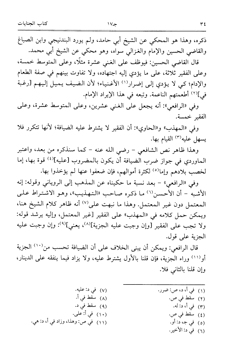 قال القاضي الحسين: فيوظف على الغني عشرة مثلا، وعلى المتوسط خمسة، وعلى الفقير ثلاثة، على ما يؤدي إليه اجتهاده، ولا تفاوت بينهم في صفة الطعام والإدام، كي لا يؤدي إلى إضرار الأغنياء؛ لأن الضيف يميل إليهم [رغبة في] أطعمتهم الناعمة. وتبعه في هذا الإيراد الإمام.