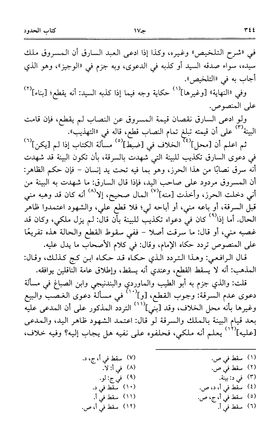 في "شرح التلخيص" وغيره، وكذا إذا ادعى العبد السارق أن المسروق ملك سيده، سواء صدقة السيد أو كذبه في الدعوى، وبه جزم في "الوجيز"، وهو الذي أجاب به في "التلخيص".