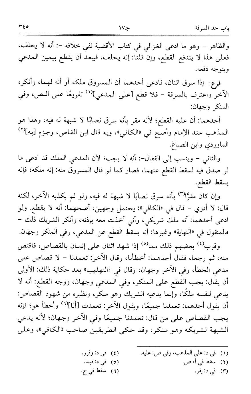 وإن كان مقرا بأنه سرق نصابا لا شبهة له فيه، ولو لم يكذبه الآخر، لكنه قال: لا أدري – قال في "الكافي": يحتمل وجهين، أصحهما: أنه لا يقطع. ولو ادعى أحدهما: أنه ملك شريكي، وأني أخذت معه بإذنه، وأنكر الشريك ذلك – فالمنقول في "النهاية" وغيرها: أنه يسقط القطع عن المدعي، وفي المنكر وجهان.