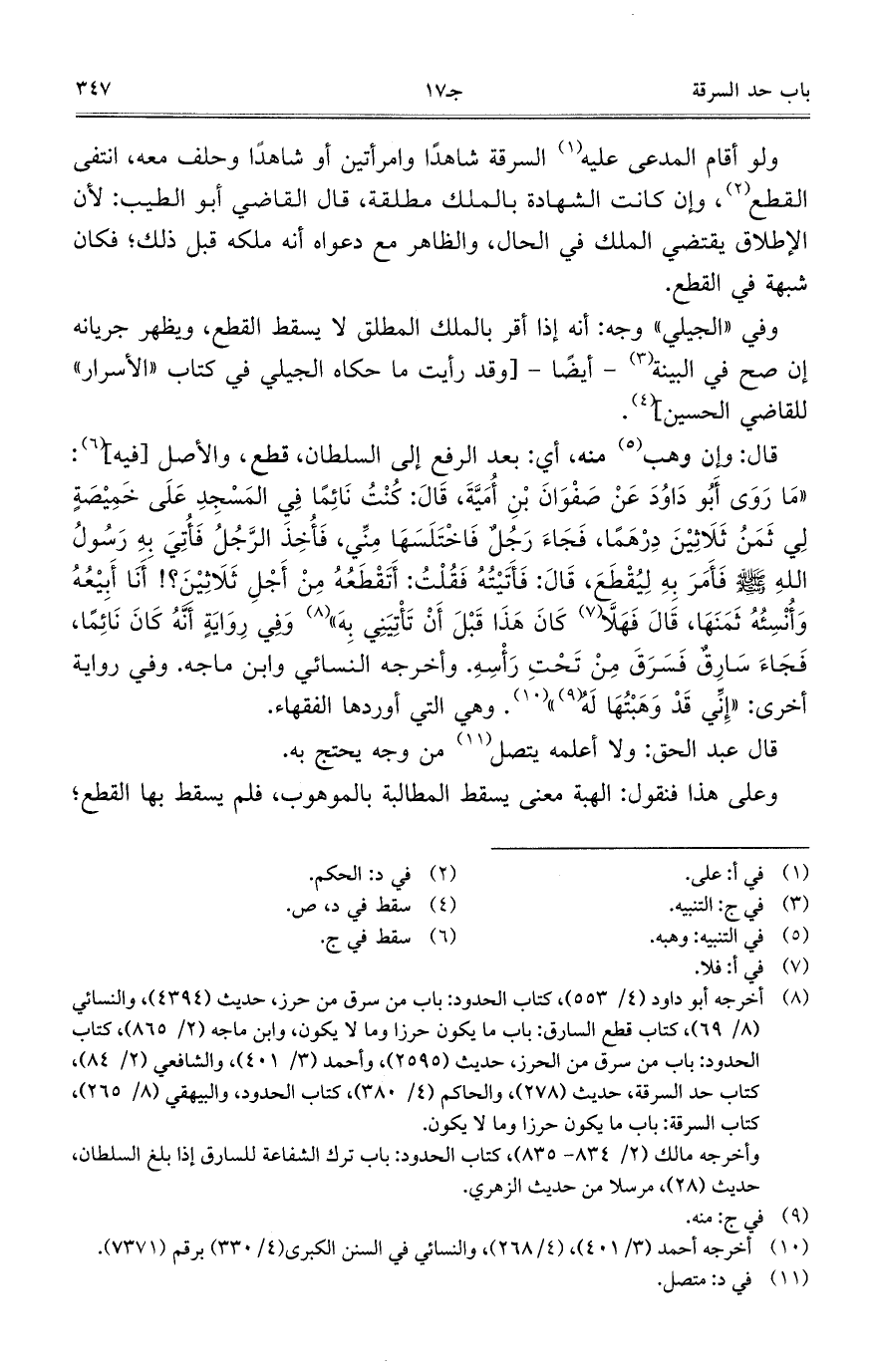 قال: وإن وهب منه، أي: بعد الرفع إلى السلطان، قطع، والأصل [فيه]: "ما روى أبو داود عن صفوان بن أمية، قال: كنت نائما في المسجد على خميصة لي ثمن ثلاثين درهما، فجاء رجل فاختلسها مني، فأخذ الرجل فأتي به رسول الله صلى الله عليه وسلم فأمر به ليقطع، قال: فأتيته فقلت: أتقطعه من أجل ثلاثين؟! أنا أبيعه وأنسئه ثمنها، قال فهلا كان هذا قبل أن تأتيني به" وفي رواية أنه كان نائما، فجاء سارق فسرق من تحت رأسه. وأخرجه النسائي وابن ماجه. وفي رواية أخرى: "إني قد وهبتها له". وهي التي أوردها الفقهاء.