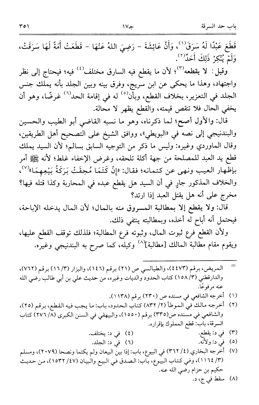 قطع عبدا له سرق، وأن عائشة – رضي الله عنها – قطعت أمه لها سرقت، ولم ينكر ذلك أحد.