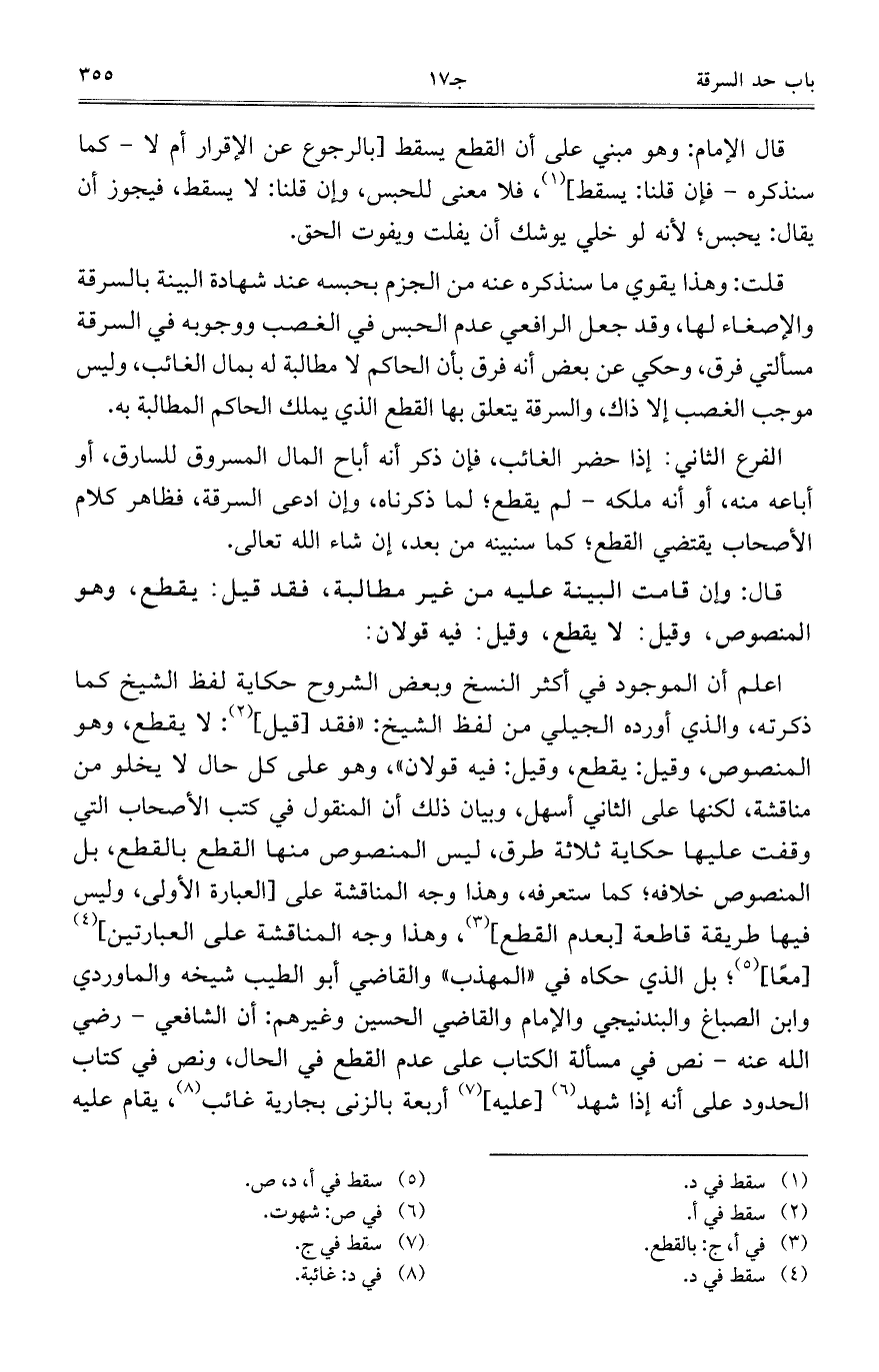 اعلم أن الموجود في أكثر النسخ وبعض الشروح حكاية لفظ الشيخ كما ذكرته، والذي أورده الجيلي من لفظ الشيخ: "فقد [قيل]: لا يقطع، وهو المنصوص، وقيل: يقطع، وقيل: فيه قولان"، وهو على كل حال لا يخلو من مناقشة، لكنها على الثاني أسهل، وبيان ذلك أن المنقول في كتب الأصحاب التي وقفت عليها حكاية ثلاثة طرق، ليس المنصوص منها القطع بالقطع، بل المنصوص خلافه؛ كما ستعرفه، وهذا وجه المناقشة على [العبارة الأولى، وليس فيها طريقة قاطعة [بعدم القطع]، وهذا وجه المناقشة على العبارتين] [معا]؛ بل الذي حكاه في "المهذب" والقاضي أبو الطيب شيخه والماوردي وابن الصباغ والبندنيجي والإمام والقاضي الحسين وغيرهم: أن الشافعي – رضي الله عنه – نص في مسألة الكتاب على عدم القطع في الحال، ونص في كتاب الحدود على أنه إذا شهد [عليه] أربعة بالزنة بجارية غائب، يقام عليه