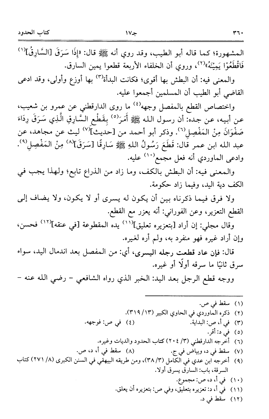 واختصاص القطع بالمفصل وجهه ما روى الدراقطني عن عمرو بن شعيب، عن أبيه، عن جده: أن رسول الله صلى الله عليه وسلم أمر بقطع السارق الذي سرق رداء صفوان من المفصل. وذكر أبو أحمد من [حديث] ليث عن مجاهد، عن عبد الله ابن عمر قال: قطع رسول الله صلى الله عليه وسلم سارقا [سرق] من المفصل. وادعى الماوردي أنه فعل مجمع عليه.