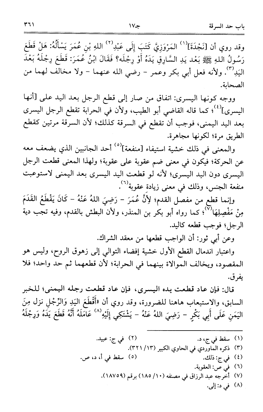 وقد روي أن [نجده] المروزي كتب إلى عبد الله بن عمر يسأله: هل قطع رسول الله ? بعد يد السارق يده أو رجله؟ فقال ابن عمر: قطع رجله بعد اليد. ولأنه فعل أبي بكر وعمر – رضي الله عنهما – ولا مخالف لهما من الصحابة.