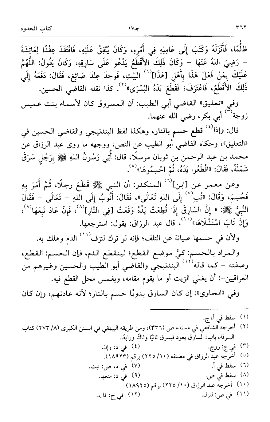 قال: وإذا قطع حسم بالنار، وهكذا لفظ البندنيجي والقاضي الحسين في "التعليق"، وحكاه القاضي أبو الطيب عن النص، ووجهه ما روي عبد الرزاق عن محمد بن عبد الرحمن بن ثوبان مرسلا، قال: أتي رسول الله صلى الله عليه وسلم برجل سرق شملة، فقال: اقطعوا يده، ثم احسموها".