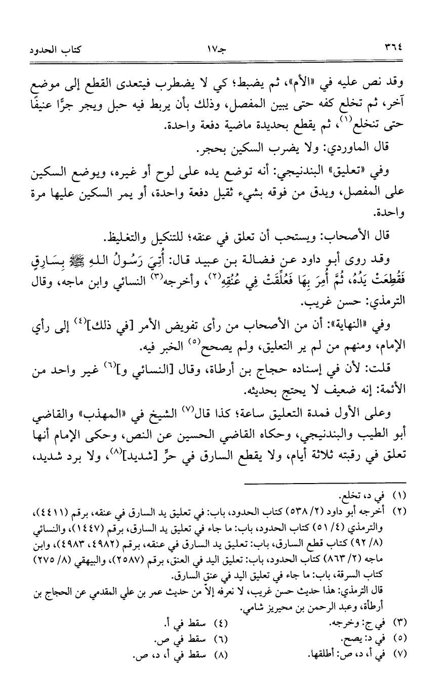 وقد روى أبو داود عن فضالة بن عبيد قال: أتي رسول الله صلى الله عليه وسلم بسارق فقطعت يده، ثم أمر بها فعلقت في عنقه، وأخرجه النسائي وابن ماجه، وقال الترمذي: حسن غريب.