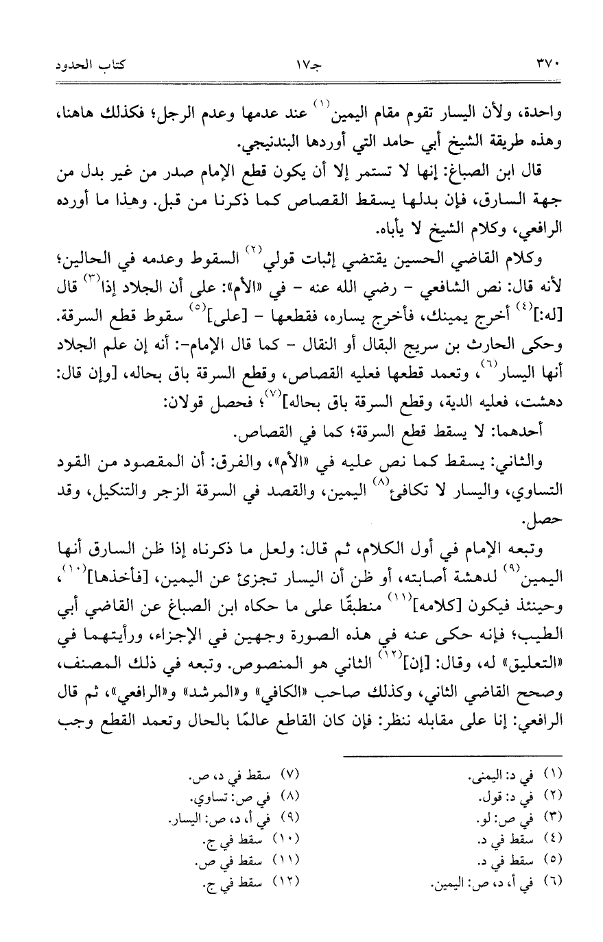 وتبعه الإمام في أول الكلام، ثم قال: ولعل ما ذكرناه إذا ظن السارق أنها اليمين لدهشة أصابته، أو ظن أن اليسار تجزئ عن اليمين، [فأخذها]، وحينئذ فيكون [كلامه] منطبقا على ما حكاه ابن الصباغ عن القاضي أبي الطيب؛ فإنه حكي عنه في هذه الصورة وجهين في الإجزاء، ورأيتهما في "التعليق" له، وقال: [إن] الثاني هو المنصوص. وتبعه في ذلك المصنف، وصحح القاضي الثاني، وكذلك صاحب "الكافي" و"المرشد" و"الرافعي"، ثم قال الرافعي: إنا على مقابله ننظر: فإن كان القاطع عالما بالحال وتعمد القطع وجب