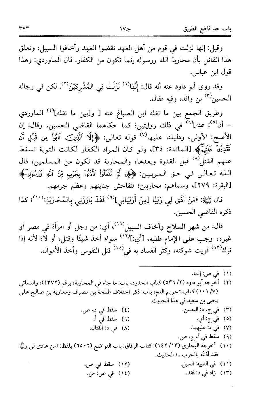 وطريق الجمع بين ما نقله ابن الصباغ عنه [و [بين ما نقله] الماوردي – أن: عنه] في ذلك روايتين؛ كما حكاهما القاضي الحسين، وقال: إن الأصح: الأولى، ودليلنا عليها قوله تعالى: {إلا الذين تابوا من قبل أن تقدروا عليهم} [المائدة: 34]، ولو كان المراد الكفار لكانت التوبة تسقط عنهم القتل قبل القدرة وبعدها، والمحاربة قد تكون من المسلمين، قال الله تعالى في حق المربين: {فإن لم تفعلوا فأذنوا بحرب من الله ورسوله} [البقرة: 279]، وسماهم: محاربين؛ لتفاحش جنايتهم وعظم جرمهم.