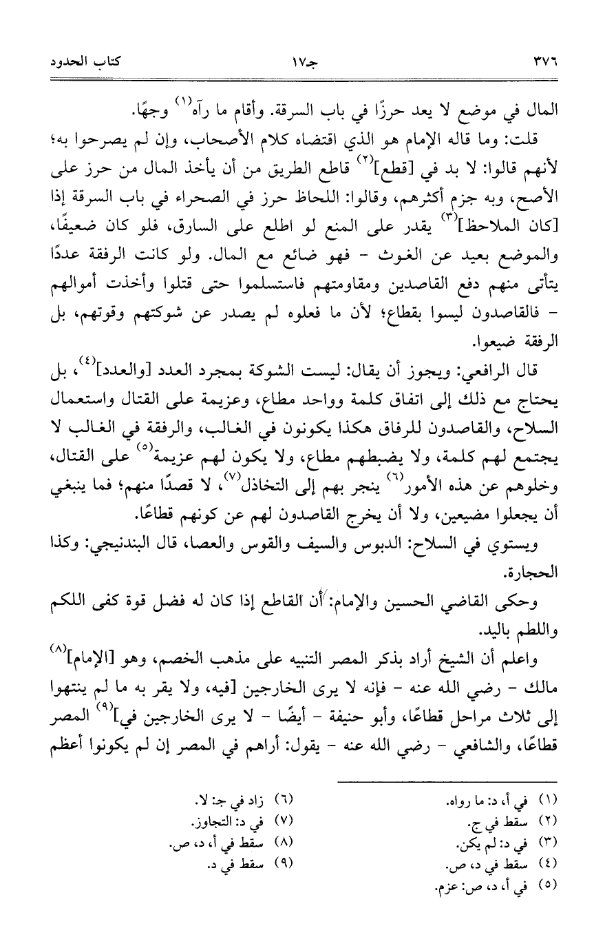 قال الرافعي: ويجوز أن يقال: ليست الشوكة بمجرد العدد [والعدد]، بل يحتاج مع ذلك إلى اتفاق كلمة وواحد مطاع، وعزيمة على القتال واستعمال السلاح، والقاصدون للرفاق هكذا يكونون في الغالب، والرفقة في الغالب لا يجتمع لهم كلمة، ولا يضبطهم مطاع، ولا يكون لهم عزيمة على القتال، وخلوهم عن هذه الأمور ينجر بهم إلى التخاذل، لا قصدا منهم؛ فما ينبغي أن يجعلوا مضيعين، ولا أن يخرج القاصدون لهم عن كونهم قطاعا.