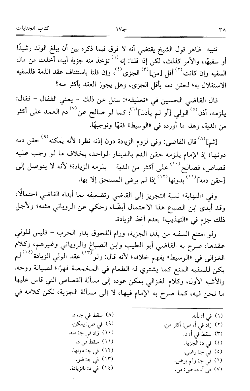 تنبيه: ظاهر قول الشيخ يقتضي أنه لا فرق فيما ذكره بين أن يبلغ الولد رشيدا أو سفيها، والأمر كذلك، لكن إذا قلنا: إنه تؤخذ منه جزية أبيه، أخذت من مال السفيه وإن كانت أقل [من] الجزى، وإن قلنا باستئناف عقد الذمة فللسفيه الاستقلال به؛ لحقن دمه بأقل الجزى، وهل يجوز العقد بأكثر منه؟