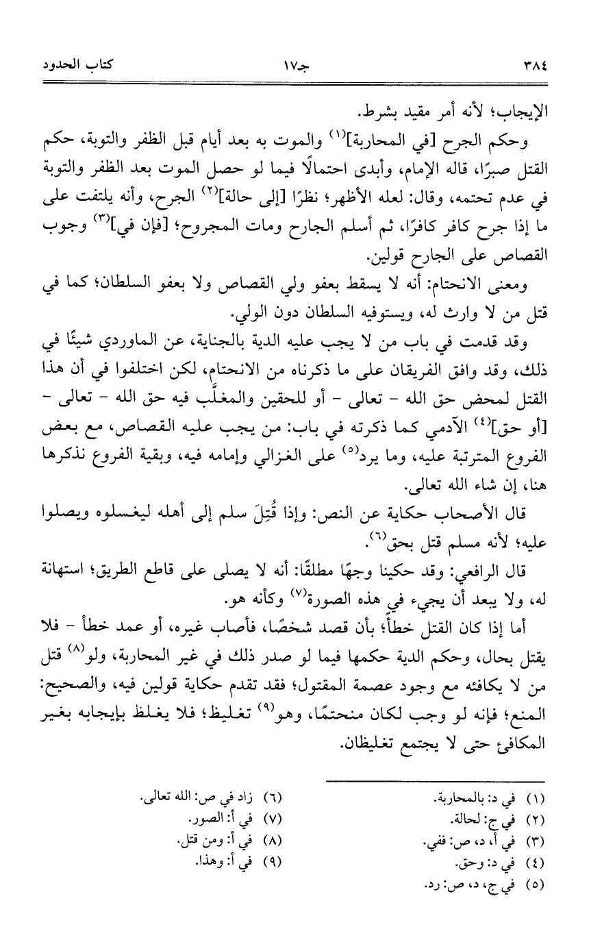 وحكم الجرح [في المحاربة] والموت به بعد أيام قبل الظفر والتوبة، حكم القتل صبرا، قاله الإمام، وأبدى احتمالا فيما لو حصل الموت بعد الظفر والتوبة في عدم تحتمه، وقال: لعله الأظهر؛ نظرا [إلى حالة] الجرح، وأنه يلتفت على ما إذا جرح كافر كافرا، ثم أسلم الجارح ومات المجروح؛ [فإن في] وجوب القصاص على الجارح قولين.