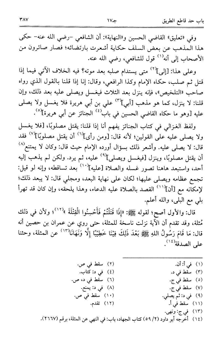 ولفظ الغزالي في كتاب الجنائز يفهم أن إذا قلنا: يقتل مصلوبا، [فلا يغسل ولا يصلى عليه على القولين؛ لأنه قال:] ومن رأى [أن يقتل مصلوبا] فقد قال: لا يصلى عليه. وأشعر ذلك بسؤال أورده الإمام حيث قال: وكان لا يمتنع أن يقتل مصلوبا، وينزل [فيغسل ويصلى] عليه، ثم يرد. ولكن لم يذهب إليه أحد، واستبعد هاهنا تصور غسله والصلاة [عليه] بعد تساقطه، وإنه لو قيل: تجمع عظامه ويصلى عليها؛ لكان على نهاية البعد، ومجلي قال: لا يبعد ذلك؛ لإمكانه مع [أن] القصد بالصلاة عليه الدعاء، وهذا يلحقه، وإن كان قد تهرأ بلي مع البلى، والله أعلم.
