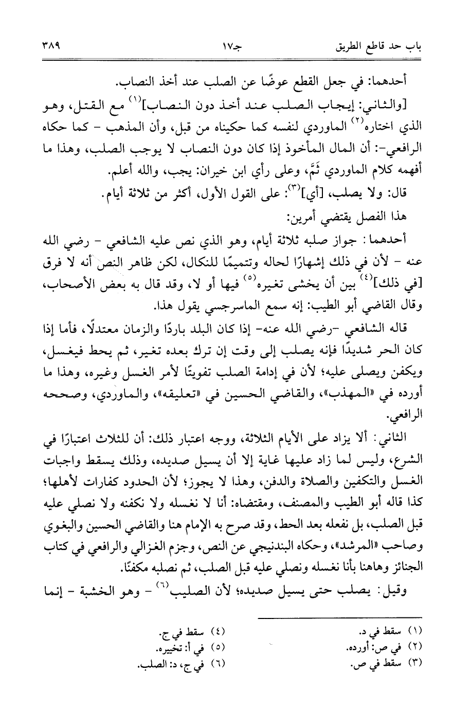 [والثاني: إيجاب الصلب عند أخذ دون النصاب] مع القتل، وهو الذي اختاره الماوردي لنفسه كما حكيناه من قبل، وأن المذهب – كما حكاه الرافعي -: أن المال المأخوذ إذا كان دون النصاب لا يوجب الصلب، وهذا ما أفهمه كلام الماوردي ثم، وعلى رأي ابن خيران: يجب، والله أعلم.