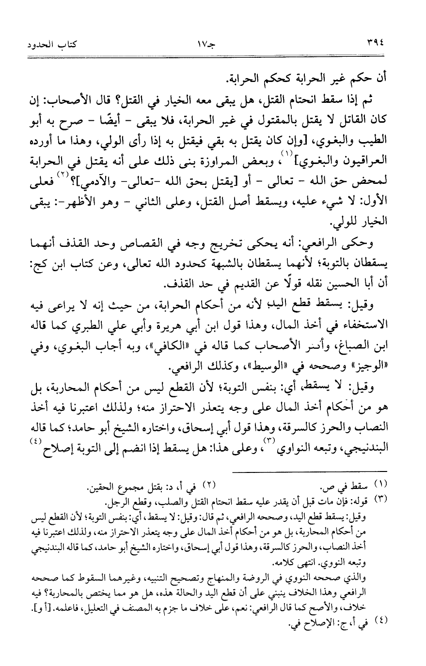 ثم إذا سقط انحتام القتل، هل يبقى معه الخيار في القتل؟ قال الأصحاب: إن كان القاتل لا يقتل بالمقتول في غير الحرابة، فلا يبقى – أيضا – صرح به أبو الطيب والبغوي، [وإن كان يقتل به بقي فيقتل به إذا رأى الولي، وهذا ما أورده العراقيون والبغوي]، وبعض المراوزة بنى ذلك على أنه يقتل في الحراية لمحض حق الله – تعالى – أو [يقتل بحق الله – تعالى – والآدمي]؟ فعلى الأول: لا شيء عليه، ويسقط أصل القتل، وعلى الثاني – وهو الأظهر –: يبقى الخيار للولي.