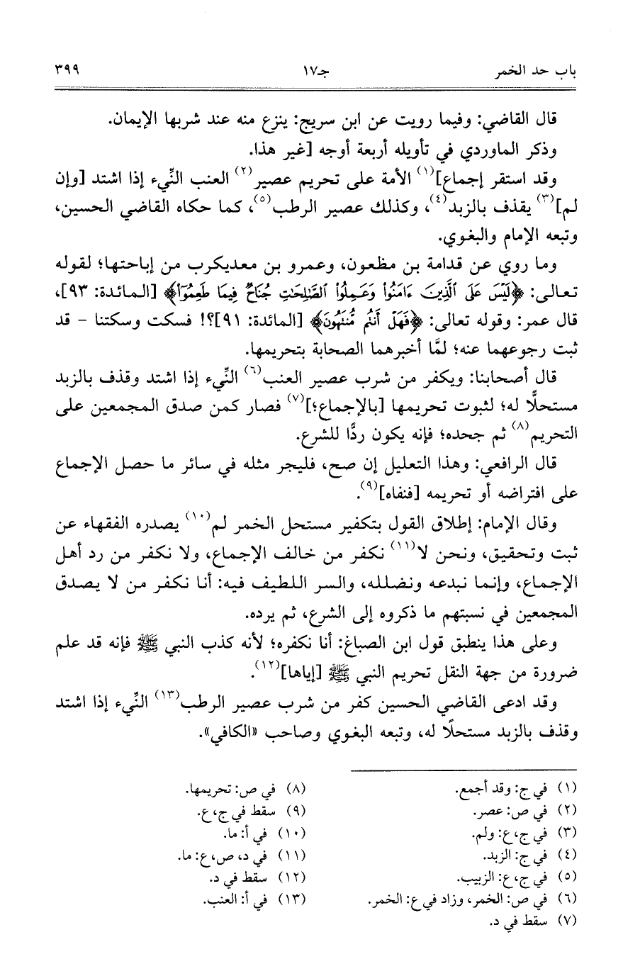 وقد ادعى القاضي الحسين كفر من شرب عصير الرطب النيء إذا اشتد وقذف بالزبد مستحلا له، وتبعه البغوي وصاحب "الكافي".